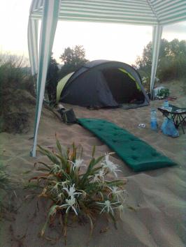 Палатката е двуслойна, саморазгъваща се, просто я отваряш и пускаш. Употребявана е, но е в много добро състояние. Води се за 3-ма души, широка, с предверие за багаж. Тествана е на дъжд - не пропуска. Всички аксесоари (колчета и въжета) са налице. Цвят - тъмносиво и зелено.